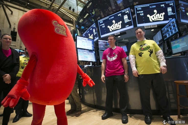 紐約證交所中,交易員看著打扮成Candy Crush的玩偶走過眼前,25號時,手機遊戲Candy Crush製造商King Digital Entertainment初次公開募股(IPO)集資5億美元,但報導指出,由於Candy Crush Saga逐漸退流行,該公司也一直沒有推出讓人眼睛一亮的新遊戲,投資人對King的股票似乎興趣缺缺。上市第一天,King股價從開盤的下跌10%,一路下滑到收盤時重挫15.56%,以19美元作收。