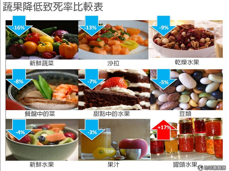 附帶一提,新鮮蔬菜對人體有最強的健康效果,其次是沙拉,再來是水果。研究發現,果汁雖然有營養,但在增進健康上卻沒有甚麼價值,而罐頭水果則增加了死亡率的發生,會有這樣的狀況,專家就表示可能是因為罐頭水果是浸泡在糖漿中的關係。