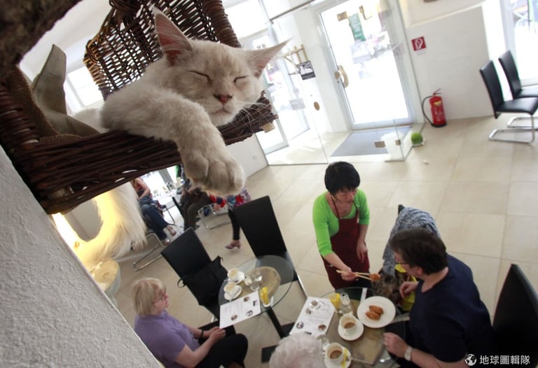 對我們來說很普遍的貓咖啡,在奧地利卻是相當得來不易的,照片中的Cafe Neko就是在當地政府辯論了三年後才登場的店家,奧地利對於餐飲衛生的疑慮讓這樣的咖啡店變得罕見。