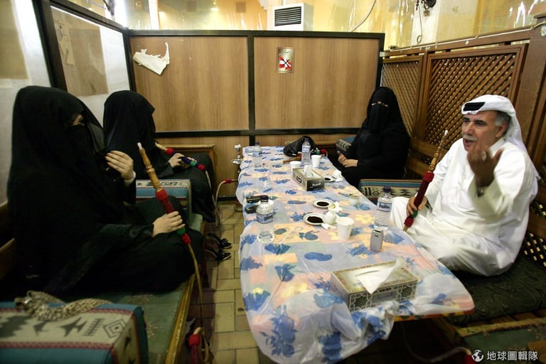 照片中的男子坐在當地老市場內的咖啡店中,他身後有大大的字樣寫著「願真主阿拉讚美先知穆罕默德以及他的跟隨者」(May Allah praise Prophet Mohammad and his followers)。