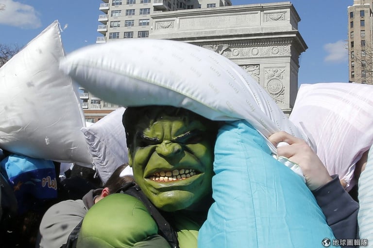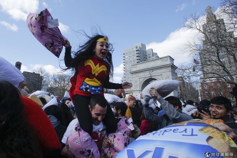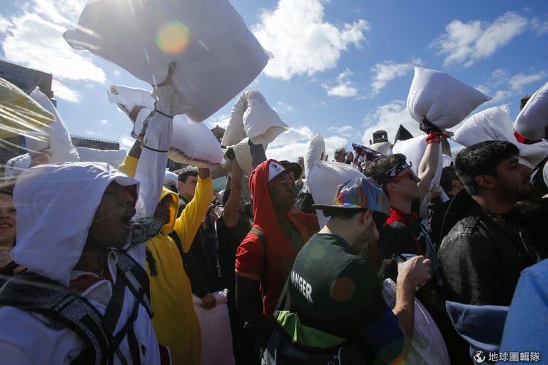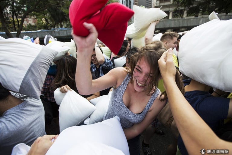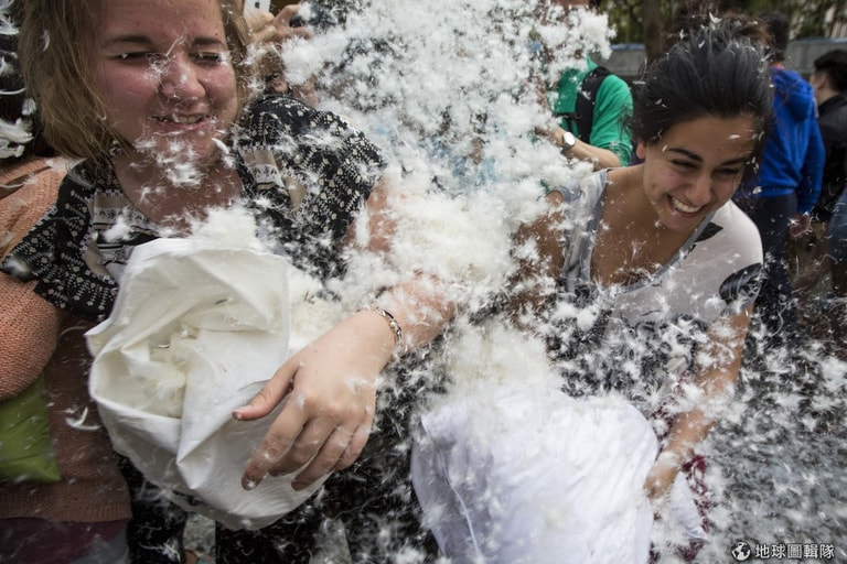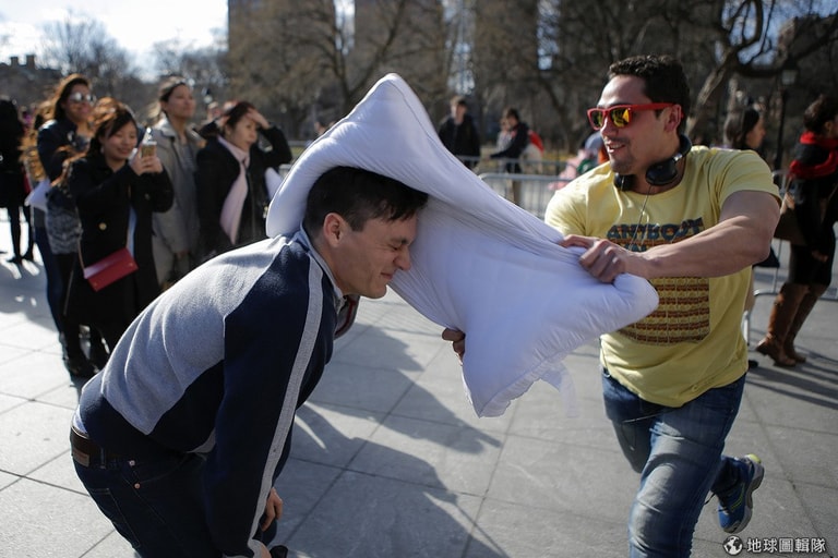 4月5日這天,世界各地主要大城都出現抱著枕頭的民眾,他們一聽到哨音就開始朝旁人揮動手上的大枕頭,亞洲地區的香港就可以見到許多民眾開心「參戰」。