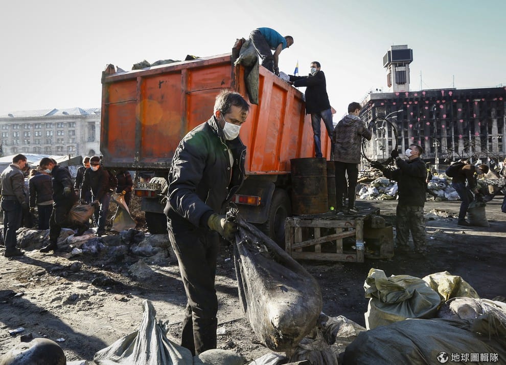 烏克蘭首都基輔的獨立廣場上,開始有自願者出現清掃環境。