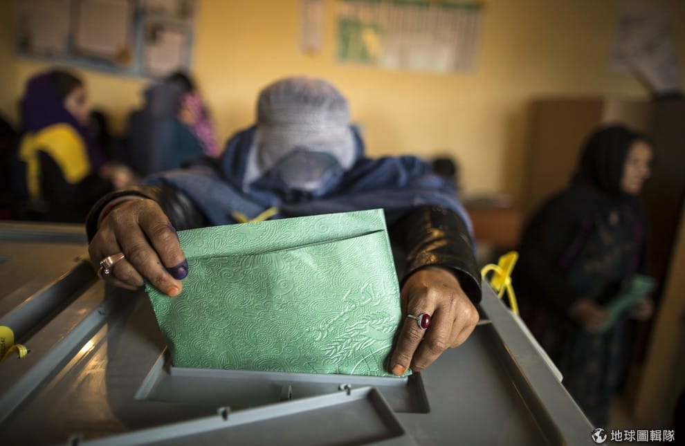 阿富汗的女性正朝投票箱內丟入她的選票,她的手指有清楚可見的藍色印泥,代表已經有參與投票。阿富汗在5號時進行備受矚目的總統大選,這是當地繼恐怖組織塔利班2001年垮台後,首度以民主方式進行政權轉移。