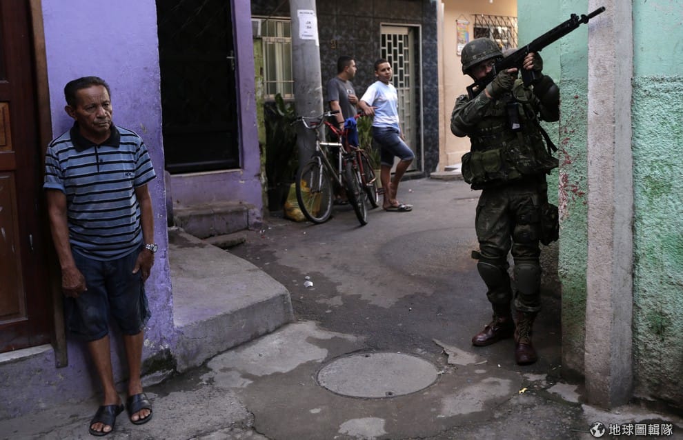 照片中的巴西軍方正在貧民區中巡邏。當地的毒品走私集團在近日攻擊貧民窟的警察哨,里約熱內盧的警方為了平息這些混亂,決定派駐聯合軍隊進駐到貧民窟中。