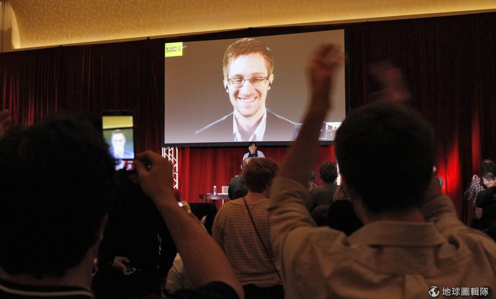 參加國際特赦組織大會的人們看著眼前的投影幕,上方出現爆料美國政府竊聽案的愛德華斯諾登(Edward Snowden),與會者同聲歡呼表示歡迎他的現身。
