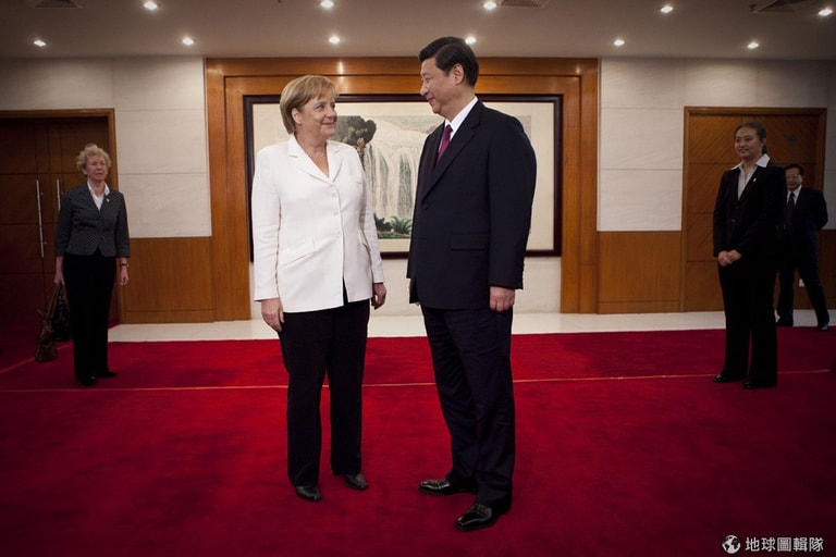 德國總理梅克爾出訪大陸,兩天的行程中與習近平在人民大會堂內相見歡。圖片來源:Diego Azubel-Pool/Getty Images