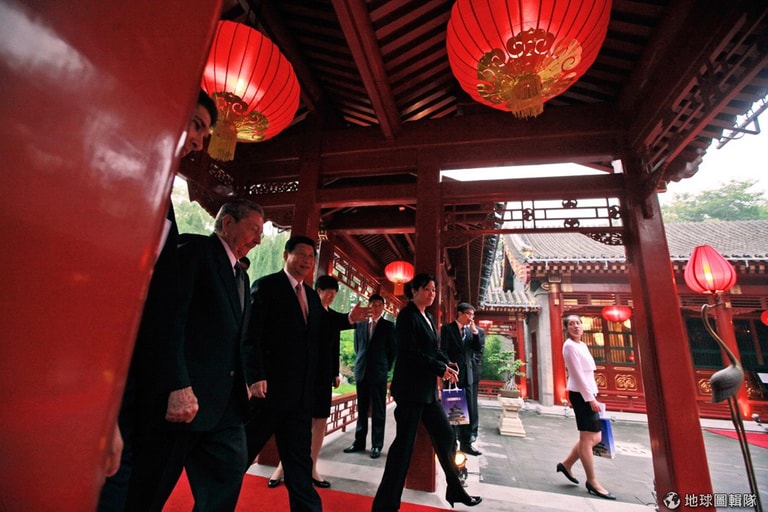 古巴總統卡斯楚在7月的時候訪中,照片中的他們走在北京的「釣魚台國賓會館」(Diaoyutai state guesthouse)廊下。圖片來源:Ng Han Guan - Pool/Getty Images