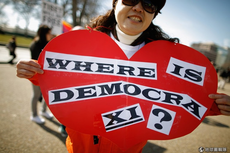 今年2月出訪美國的時候,許多支持西藏獨立、台灣獨立、法輪功等等團體在白宮外抗議。圖片來源: Chip Somodevilla/Getty Images