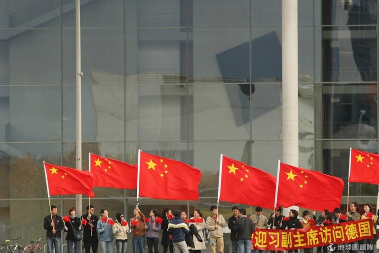 2009年習近平訪問德國的時候,當地的大陸僑胞高舉旗幟歡迎他!圖片來源:Sean Gallup/Getty Images