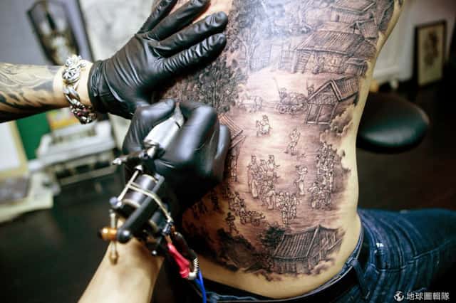 24歲刺青師楊正偉,他正在名叫「夏天」的男子背上刺上有名的「清明上河圖」,這精細的刺青花了五天的時間,終於即將完成。這幅世界級的名畫以長50公分,寬38公分的大小呈現在背上。