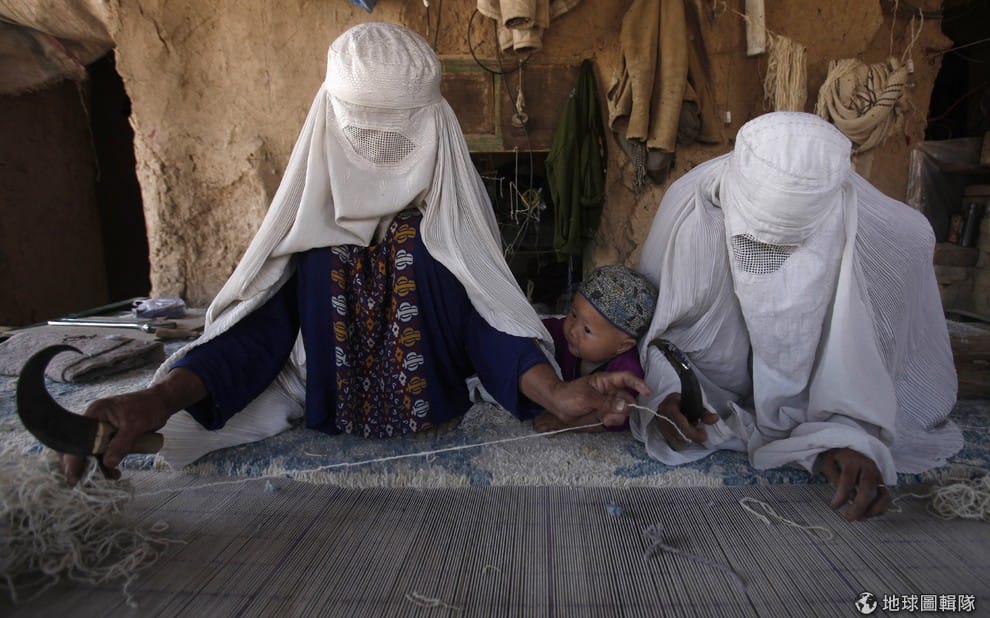 照片中是阿富汗的哈札拉族(Hazara)婦女,她們正忙著編織地毯。1982年開始,不少從阿富汗逃避戰亂到巴基斯坦的女性,開始了編織地毯的工作,這些紡織品每平方公尺價格可從美金31元到103元(約台幣936元到3100元)不等,價格端看編織工藝的精細程度決定。至於地毯的編織花費時間可以長達兩個月之久,買家則是東西方皆有。