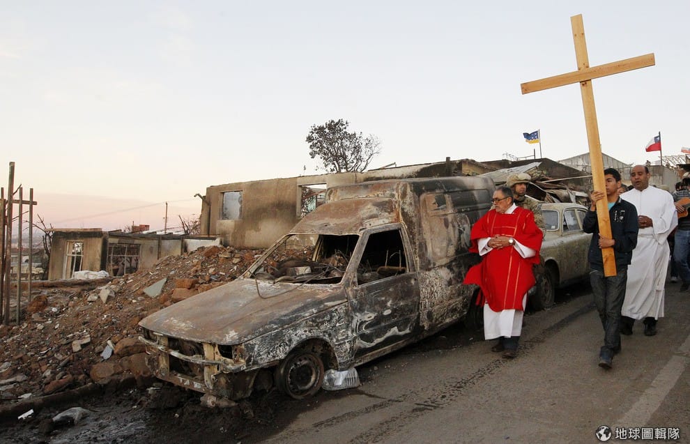 一名男性舉著十字架走過剛遭大火肆虐過的瓦爾帕萊索市(Valparaiso),18號這天好是今年的「耶穌受難日」,居民復刻了耶穌當年背著十字架前往刑場的「十字架之路」(Way of the Cross)。
