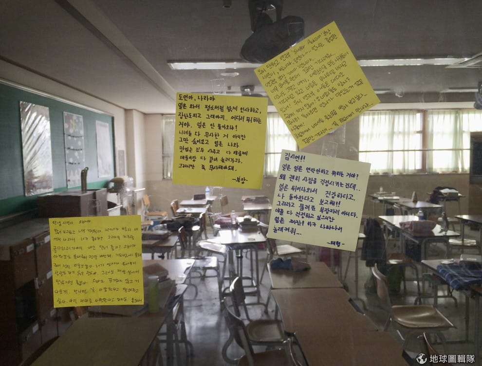 學生給失蹤同學的留言貼滿了窗戶。南韓日前發生20年來最嚴重的船難事件,其中有許多遇難者是南韓壇園高中的學生,隨著黃金救援48小時過去,剩下250位左右仍沒被找到的師生恐怕凶多吉少。