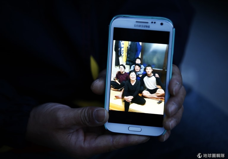 目前救難工作仍在進行,已有174人被救出,但周末時搜救人員另外發現了26具遺體,這讓死亡乘客數字累積達到58人,還有244人下落不明。照片中是失蹤學生的父親金先生,他拿起手機給攝影記者看,金先生表示照片中最後一排抱著他的小兒子目前仍是失蹤狀態。