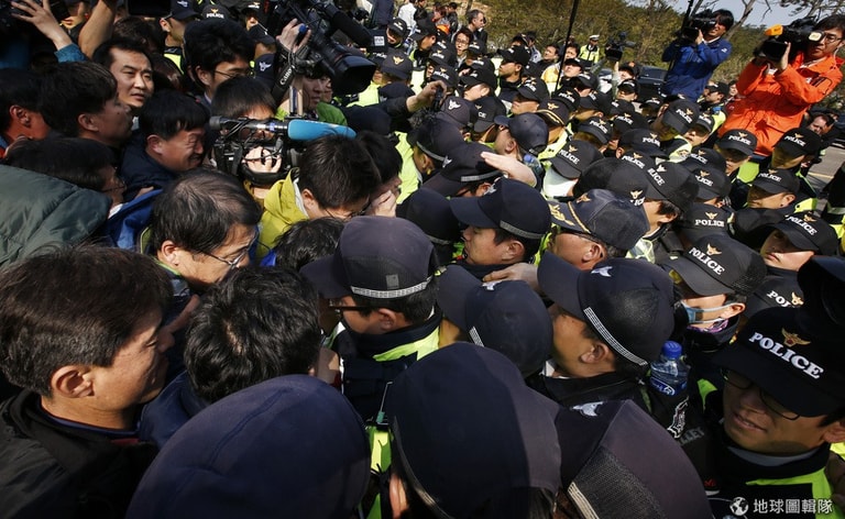 世越號傳出翻覆消息後,許多乘客的家屬親友全聚集到意外附近的珍島(Jindo)上,不少人對救援進度不滿表示抗議,就有家屬表示他們要前往首爾的總統府抗議,期間就與警方發生推擠衝突。
