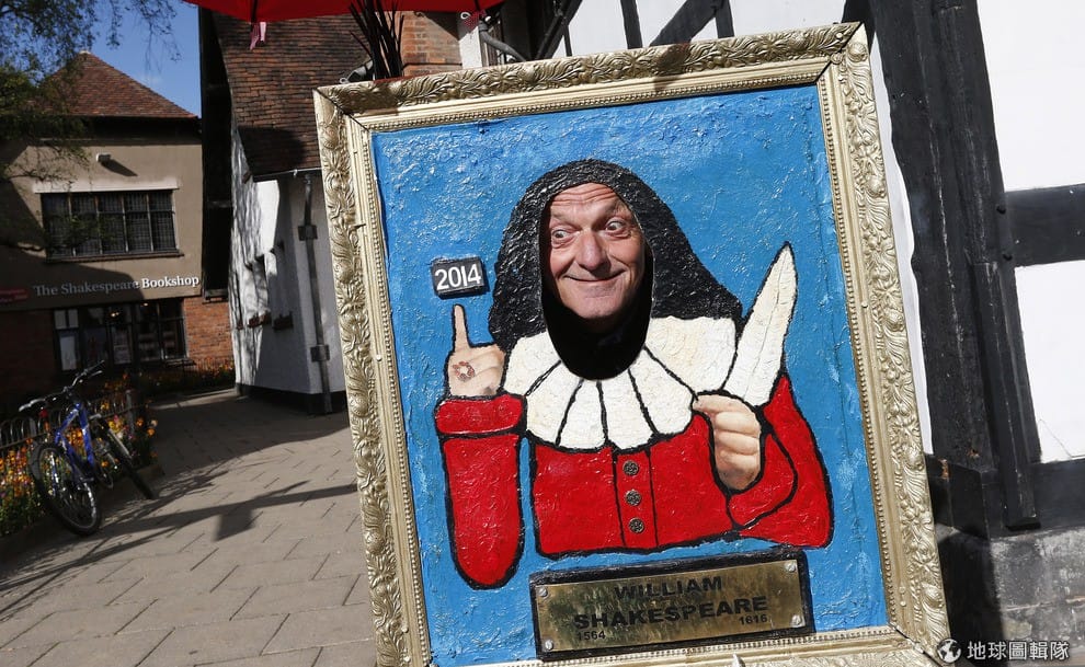 莎士比亞的故鄉史特拉福(Stratford-upon-Avon)近期舉辦大型的慶祝活動,紀念莎士比亞冥誕450歲,照片中的遊客和活動看板合照。