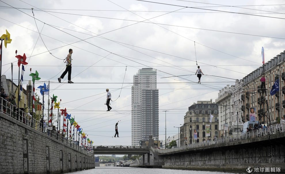 布魯塞爾市區內在26號時出現44位走鋼索的表演者,他們要一起挑戰同時越過運河。