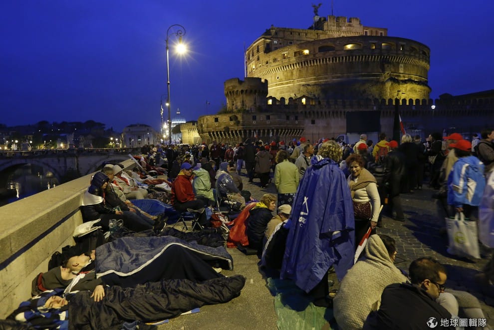 照片中的信眾們正在聖天使城堡(Castel Sant'Angelo)外架帳篷過夜,他們要等待27號重要的封聖大典。4月27日時,天主教即將舉行盛大的封聖儀式,為已故的若望二十三世及若望保祿二世舉行封聖典禮,因為這是教廷史無前例同時為兩位教宗封聖,全球12億信徒都關注這別具歷史意義的儀式。