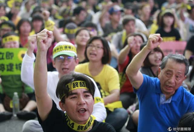 示威民眾揮舞終結核四等標語的旗幟