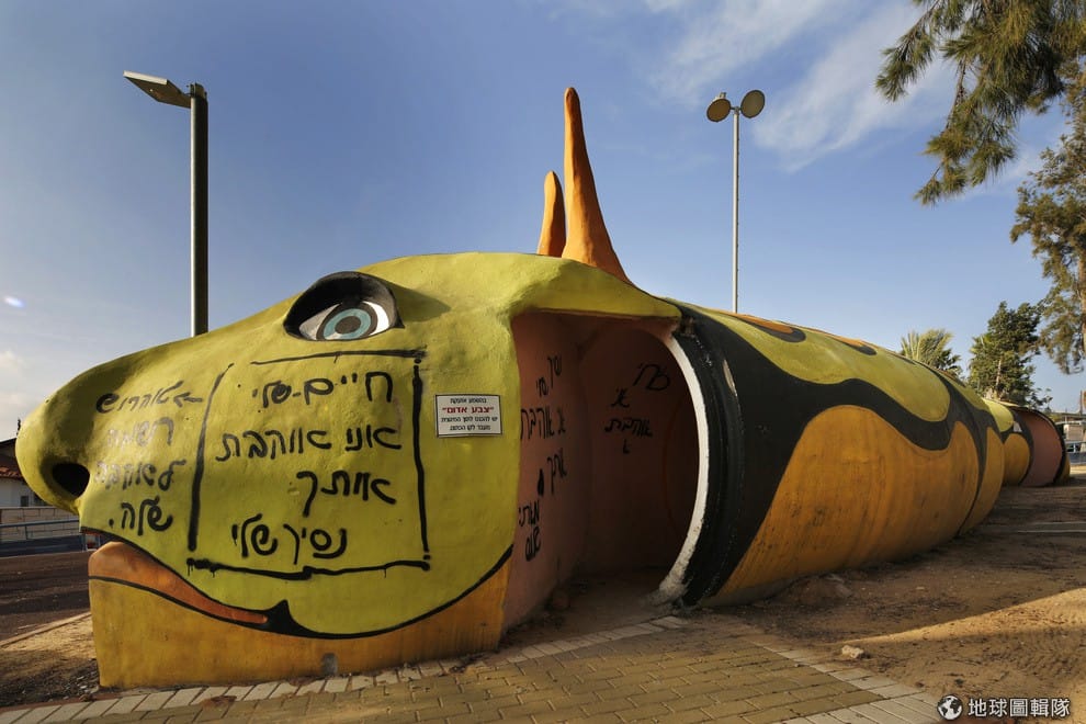 遊樂場內長得像蛇一樣的建物是給孩子們躲炸彈的防空洞。2001年開始,以色列的斯德洛特(Sderot)當地就受到超過8600顆來自加薩走廊的飛彈襲擊,這距離加薩走廊僅1公里遠的市鎮,因為沒有完全受到以色列鐵穹防空導彈系統(Iron Dome defence system)的保護,當地2萬5千名居民就籠罩在隨時被炸彈攻擊的陰影下。