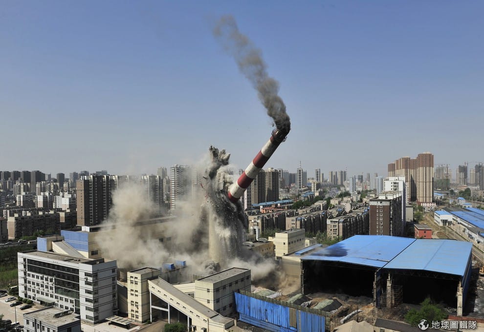 照片中可見瀋陽第三熱力公司的煙囪在爆破後倒下,根據報導,這座煙囪在2001年建成,高度150公尺,是遼寧省最高的煙囪,這次爆破後,他們將在5月中進行第二次爆破,接著會在原址修建與原本煙囪同高,但寬多出2公尺的新煙囪,預計可承擔更多的任務量。