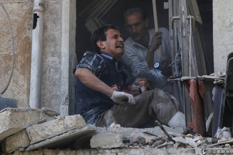 照片中的男子抱著死去的孩子痛哭,他們所住的敘利亞阿勒坡城郊遭到據說是來自政府軍的炸彈攻擊。