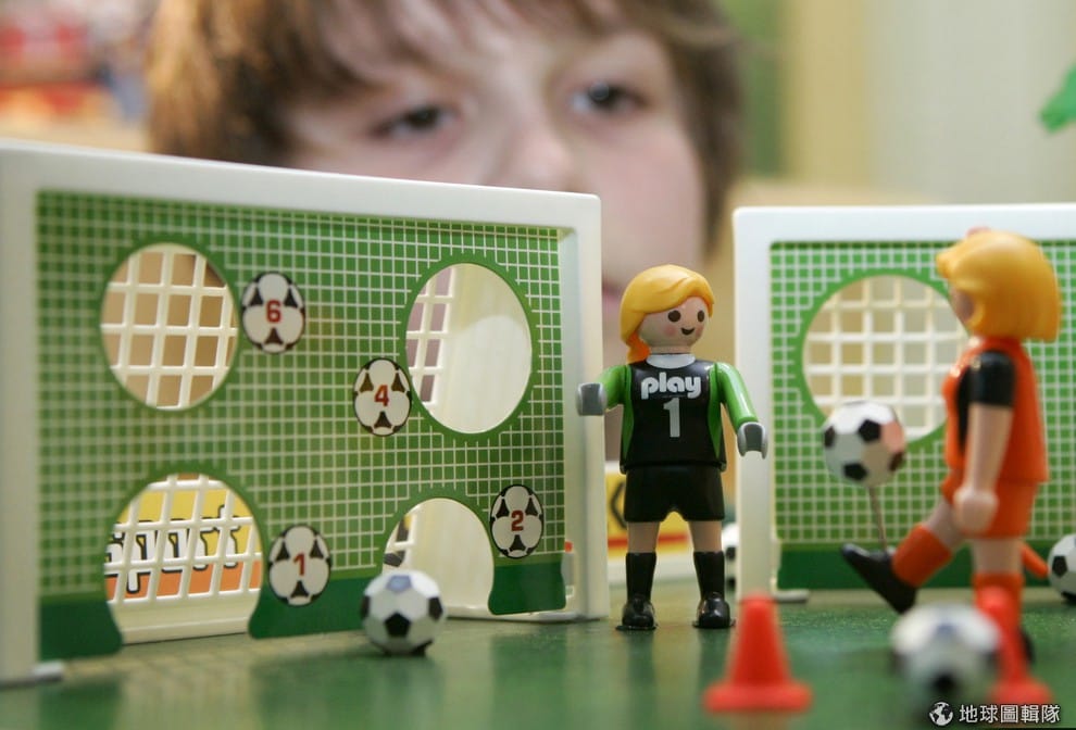 小朋友出神地看著足球員摩比人。
