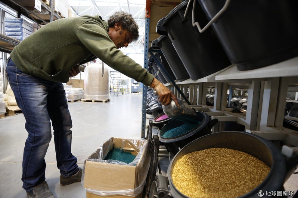 摩比人工廠的工人把五顏六色的顏料裝進桶子裡。