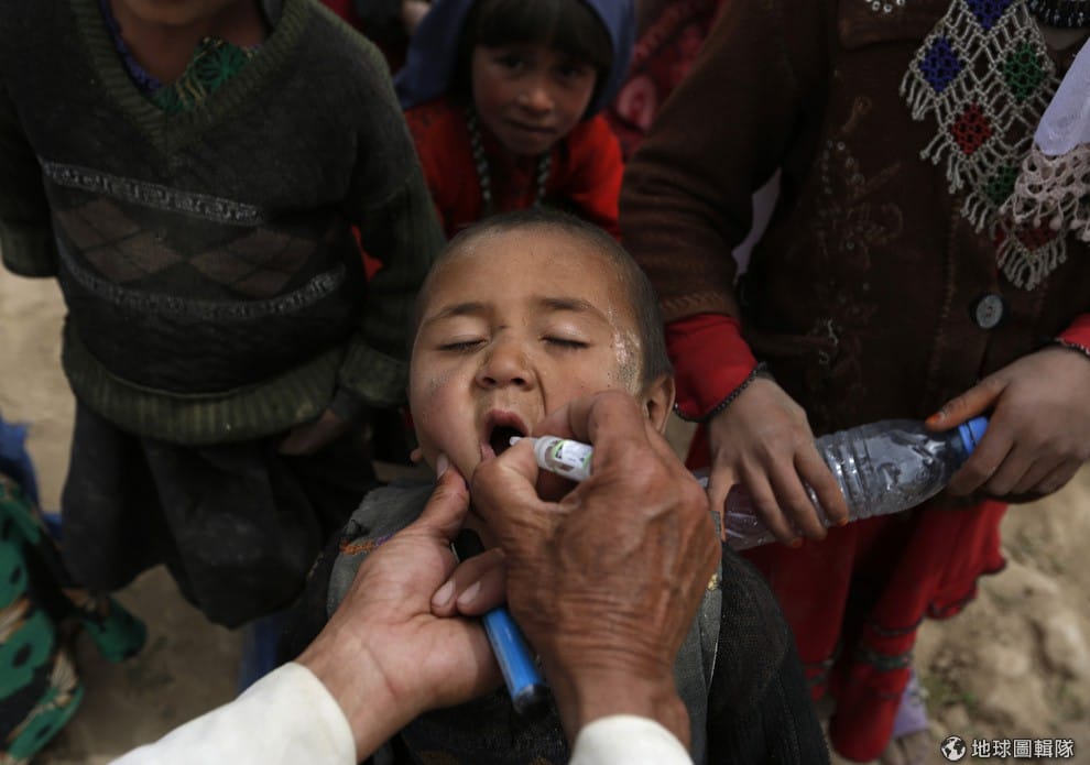 救難人員正在協助小朋友口服小兒麻痺疫苗
