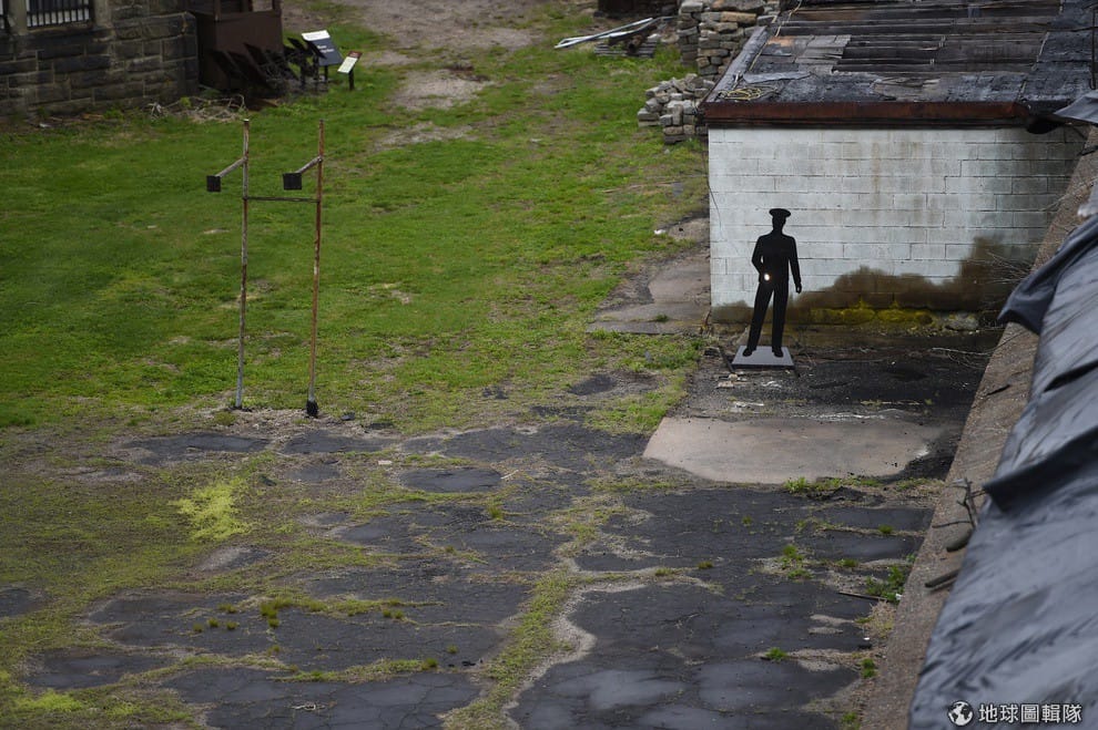 照片中是位在美國賓州的東州教養所(Eastern State Penitentiary),一片裝上手電筒的警衛剪影被放在建築物旁,這件展品屬於當地正在進行的回顧展中。