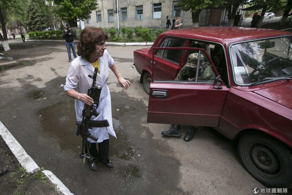 一名護士幫忙受傷的民眾下車,烏克蘭東邊的斯拉維揚斯克(Slaviansk)市區發生嚴重軍事衝突,親俄派武裝分子在5號時襲擊烏克蘭軍方,雙方發生激戰。