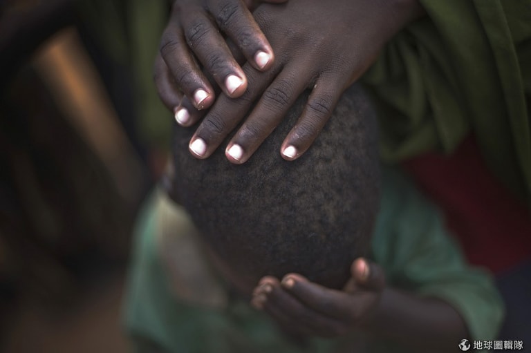 世界最大的難民營達達阿布(Dadaab)中,小女生難過得低頭哭不停,她的媽媽摸摸她的頭安撫她