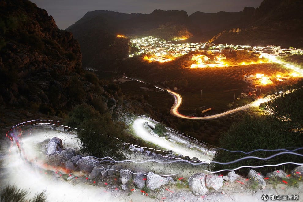 參加兩鐵路跑的參賽者們從山路間跑過,他們頭戴的燈把路上照得一片明亮,這些參賽者必須在24小時內用路跑和單車的方式完成長達101公里的路程。