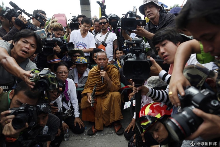 泰國僧侶伊薩(Luang Pu Buddha Issara)坐在中央,他的身邊是支持他的人們,他們正等待泰國警方要對日前發射催淚瓦斯的舉動道歉。
