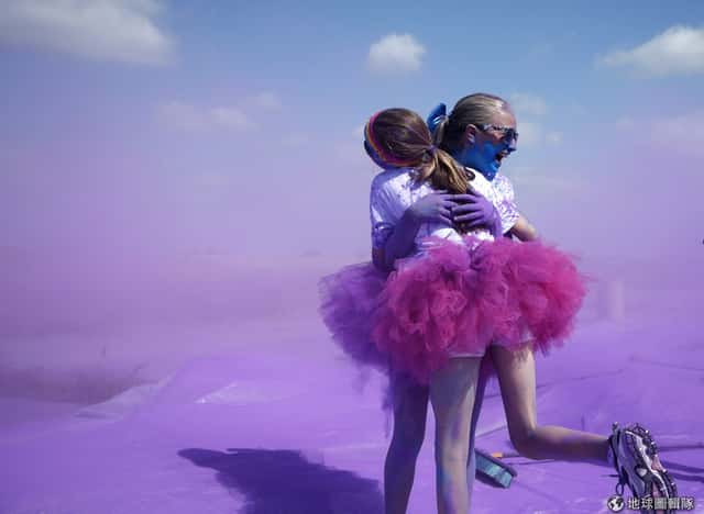 美國加州的橘郡(Orange County)在10號時舉辦5公里的彩色路跑(Orange County Color 5K Run),參賽者開心地在七彩粉末中抱在一塊。