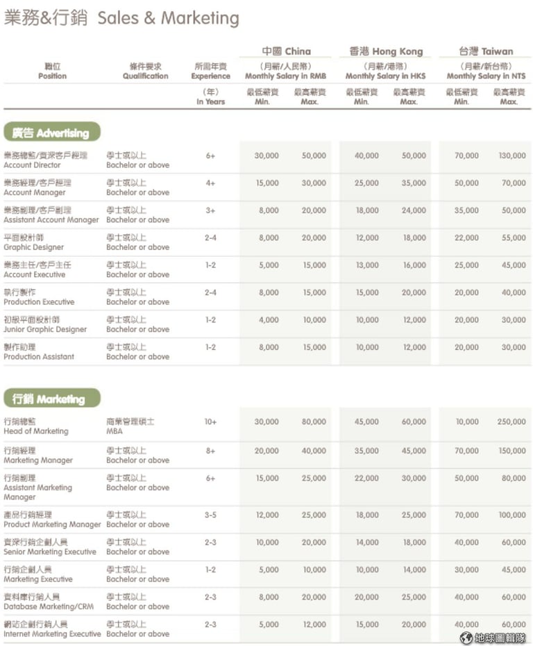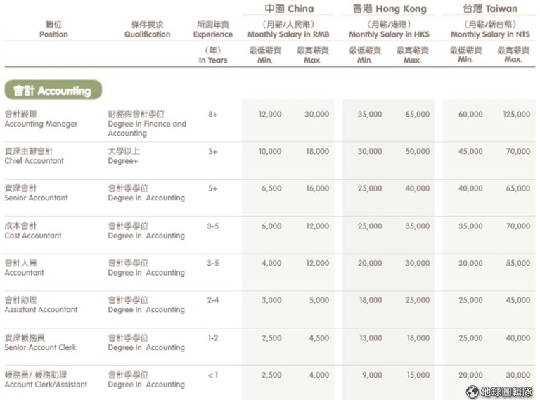兩年以上的工作經驗來算,中國市場是新台幣 3.1 萬元到 12 萬元之間,因為從業人員多。香港市場是新台幣 7.7 萬元到 19.4 萬元之間,台灣則是 5 萬元到 18 萬元之間。