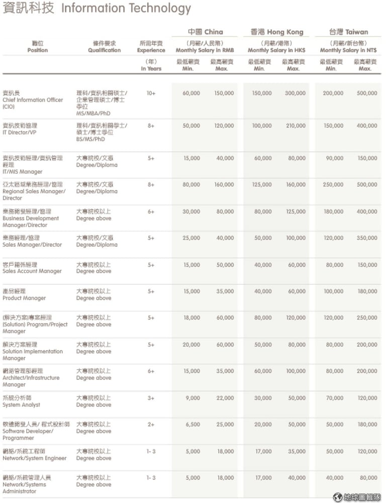 最後,我們看一下 IT 資訊人員的薪酬,發展資訊領域較久的台灣與香港,資訊長 (CIO) 的薪酬相對比中國市場要高。如果是工程師呢?