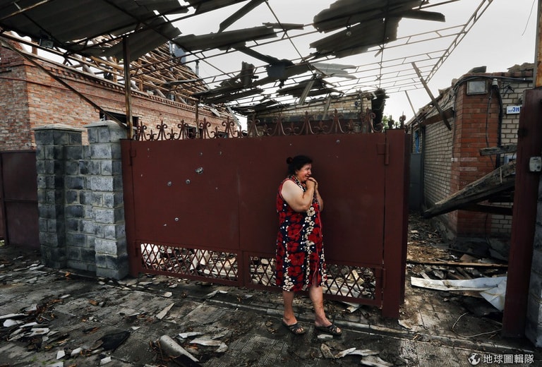 61歲的蘭(Yekaterina Len)坐在自己毀壞的屋子外大哭,她所住的斯拉維揚斯克城在20號時遭到烏克蘭軍方攻擊,許多房舍遭到波及毀壞。