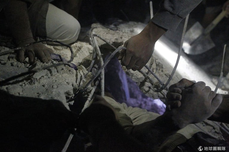 照片中的民眾正努力把被瓦礫堆埋住的男子拉出來,此處剛遭到敘利亞政府軍用「飛毛腿飛彈」(Scud missile)攻擊。