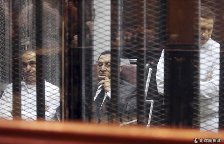 照片中央是埃及前任遭推翻下台的總統穆巴拉克(Hosni Mubarak),他在21號時遭開羅法庭判定涉嫌盜用公款,必須入獄三年。