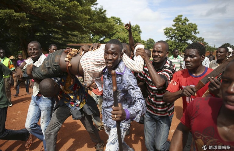 遭到法軍射傷的民眾被其他人扛著緊急送醫。