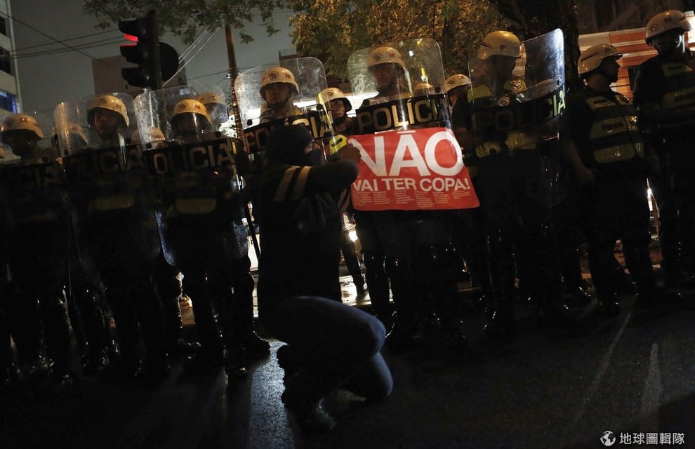 示威者們手舉「我們將不會有世界盃」的標語,他們抗議巴西政府將許多國家花費放在世界盃足球賽這場國際賽事中,因為當地的教育資源、健保、大眾交通以及犯罪率都需要預算介入協助解決問題。2014年世界盃足球賽即將在6月12日開踢。