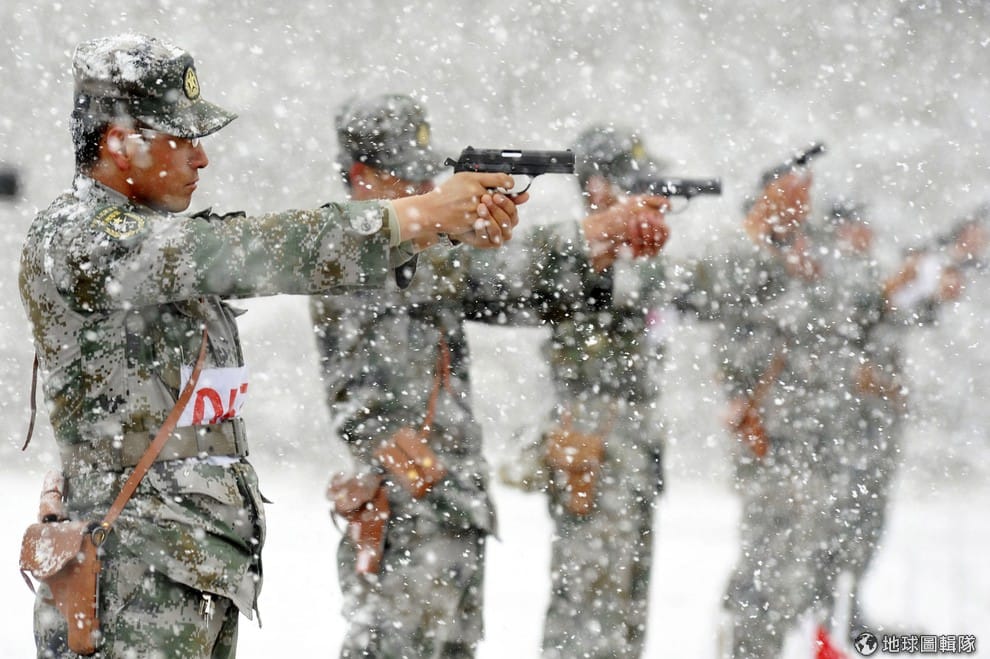 新疆維吾爾自治區中,可見人民解放軍(PLA)正在雪中練習射擊。中國近期發生多起爆炸與砍殺事件,就與維吾爾族相關,相關報導中指出,中國近半年發生數起大型恐怖襲擊,5月23日,在新疆首府烏魯木齊發生大型恐怖襲擊第二天新疆當局宣布啟動嚴打暴恐活動專項行動,將持續到明年6月。