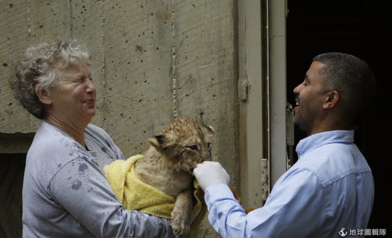 克拉克從水裡撈出渾身溼答答的小獅子,交給旁邊的飼育員泰勒。