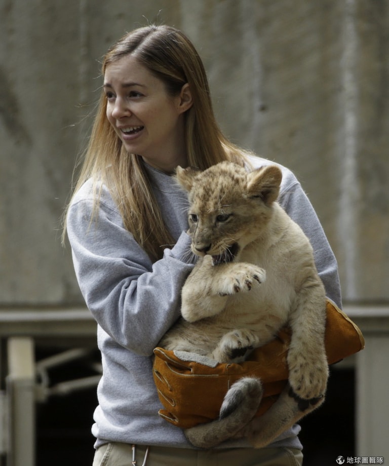 動物園的生物學家萊(Leigh Pitsko)慢慢地把小公獅放進水裡。