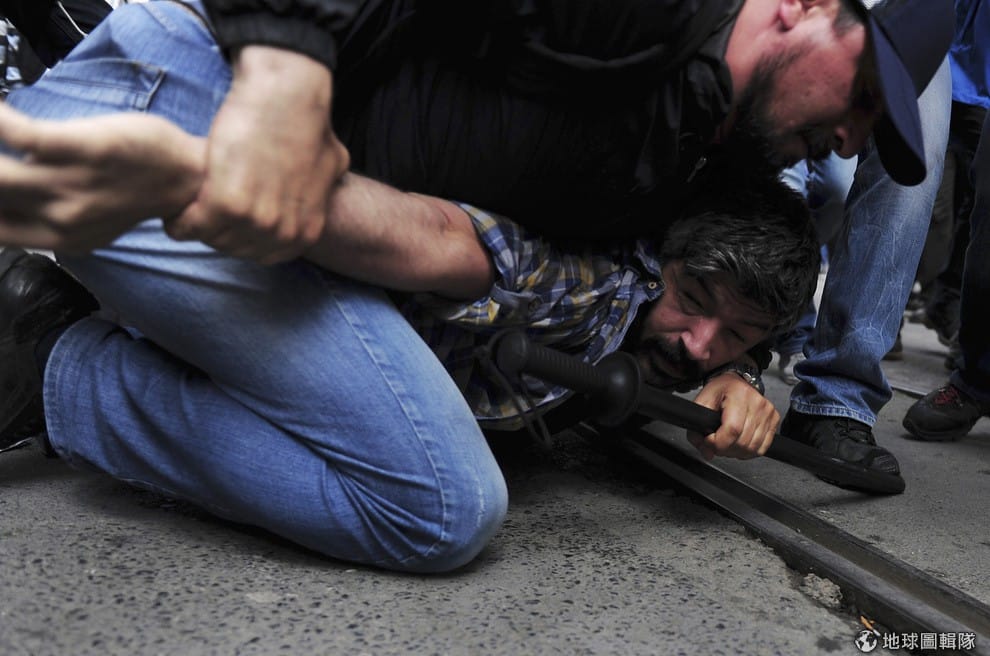 便衣刑警逮捕上街抗議的民眾,31號這天,土耳其的伊斯坦堡市區內出現大規模抗議人潮,民眾為了紀念他們反政府抗議行動屆滿周年,紛紛走上街頭。