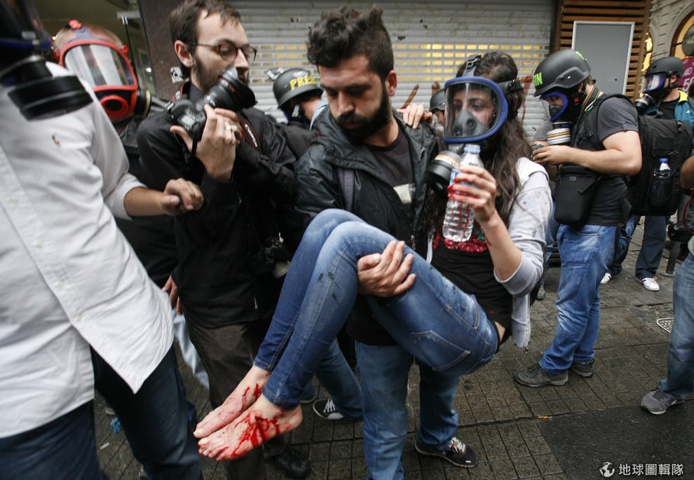 在示威衝突中因為催淚瓦斯受傷的民眾正在他人的協助下前往醫院接受治療。