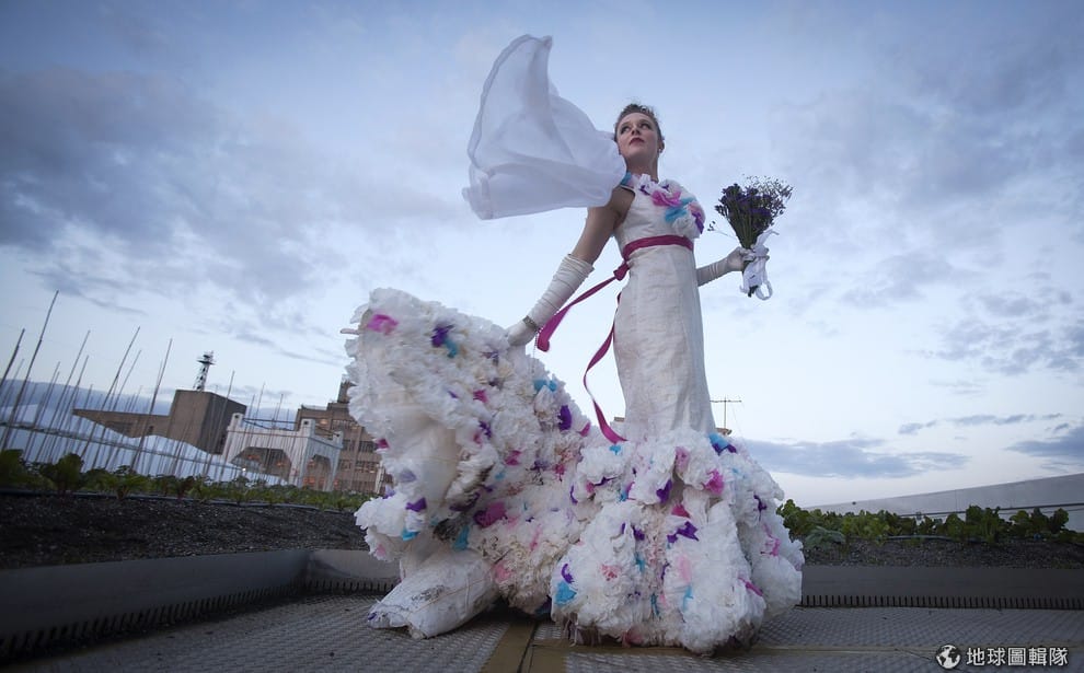 紐約布魯克林區正舉辦「垃圾時尚」(Trashion)展,照片中的女模特兒正認真地擺姿勢接受拍照,她和其他模特兒一起展示設計師運用回收物像是咖啡濾紙、衛生紙、窗框或穀物袋裝等等。