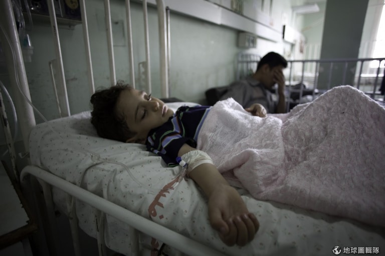 另一名巴勒斯坦小男生,生病的他奄奄一息,一旁的爸爸很擔心,他們整等著醫生過來檢查。圖片來源:Eman Mohammed/Getty Images