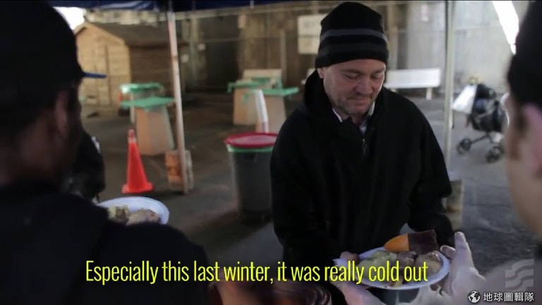 馬文(街友):「我真的很感謝(這項計畫)。像是在去年冬天的時候,那真的很冷,所以可以喝到熱咖啡、熱可可,還有熱的食物真的很棒。這就像是享受套餐一樣。這跟你只能分到一點食物不同,我們得到很多食物。」